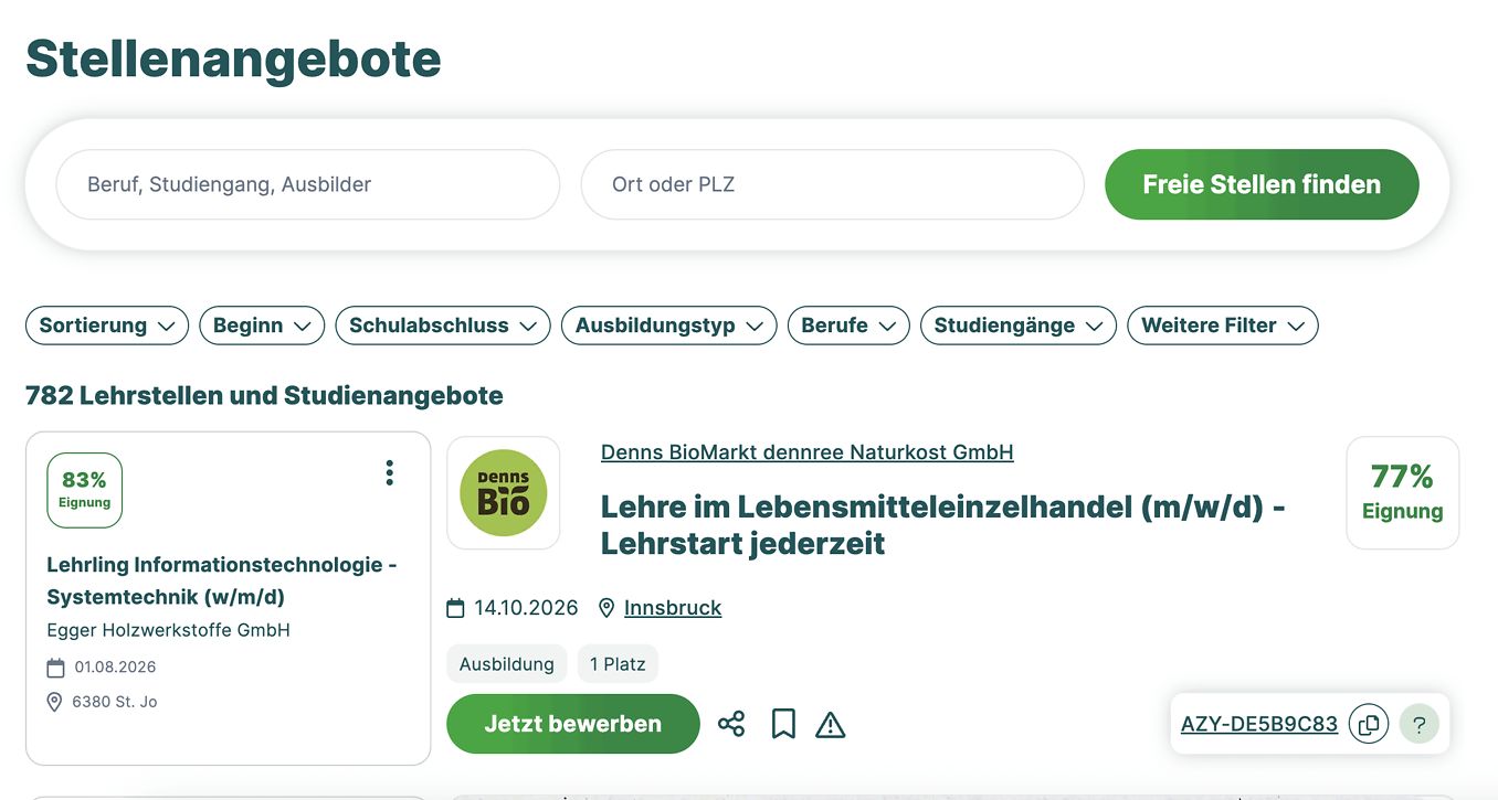 Auf Lehrstellenportal erwartet dich ein Stellenmarkt mit vielen freien Lehrstellen und Dualen Studienplätzen in deiner Region. Und mit dem Berufswahltest mit Eignungs-Check findest du genau die freien Stellen, die wirklich zu dir, deinen Wünschen und Stärken passen! Das besondere Extra: Wenn du möchtest, kannst du dein Profil freischalten. So können dich Lehrbetriebe finden und anschreiben!